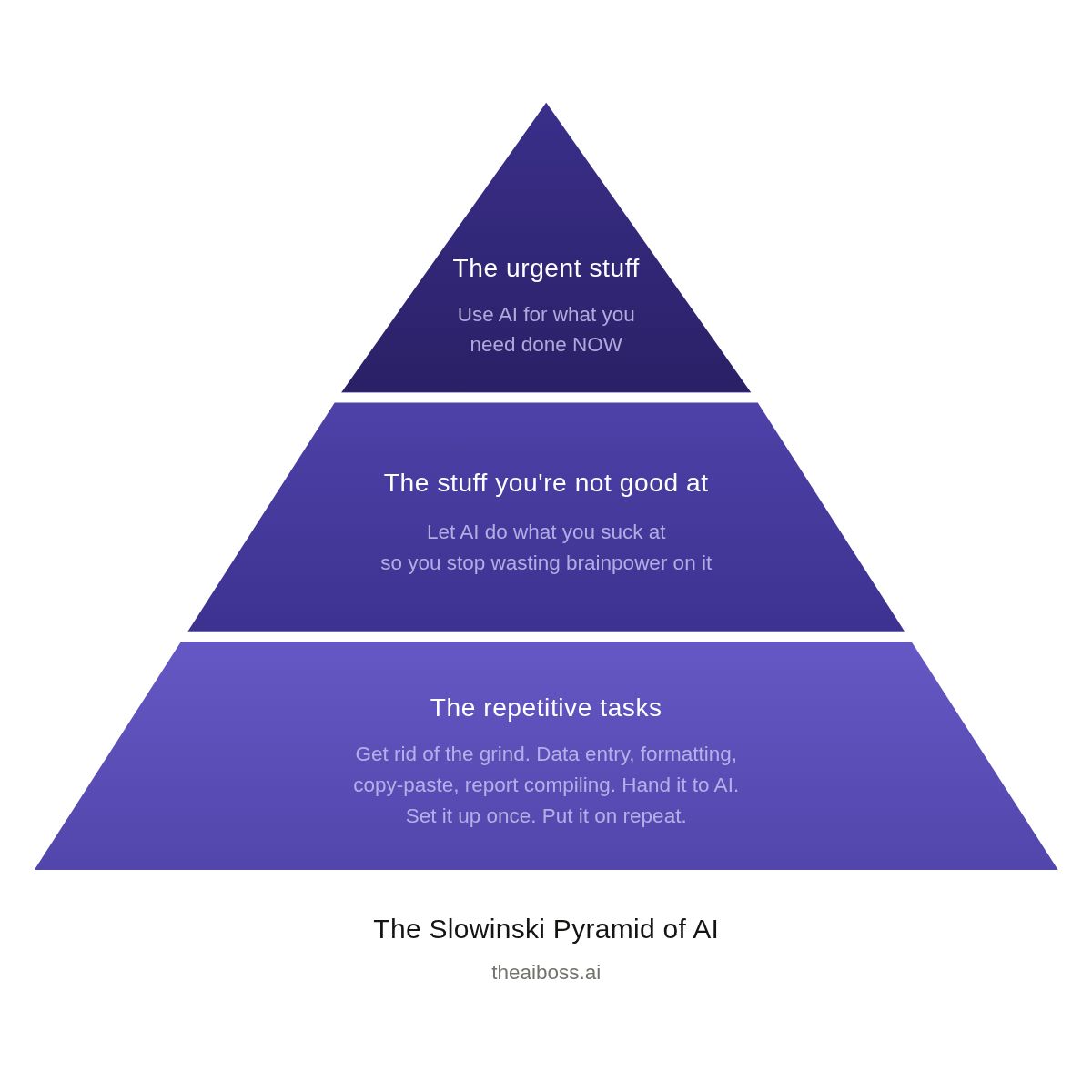 I have a framework I use called the Slowinski Pyramid. Three tiers. Think of it like Maslow's hierarchy of needs but for how you should be using AI.