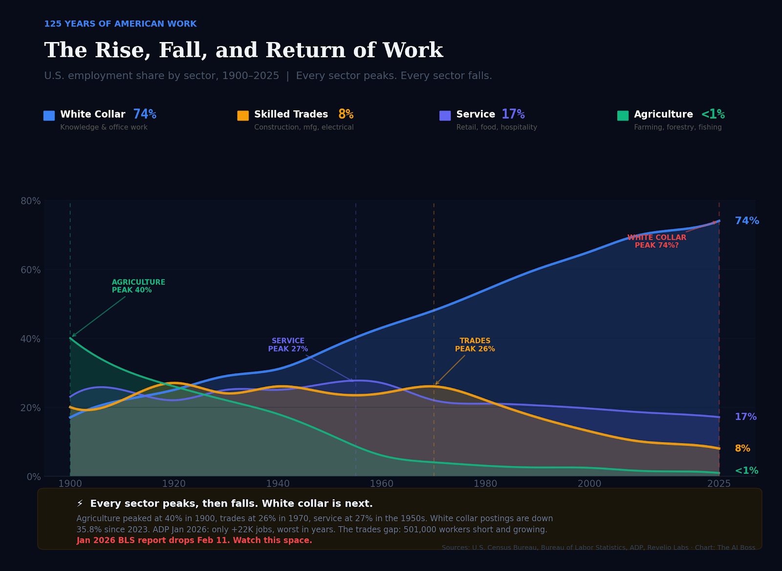 I built this chart from 125 years of U.S. Census and Bureau of Labor Statistics data. It tracks employment share by sector from 1900 to today. Look at it carefully, because every line on this chart represents millions of American careers that rose, peaked, and then fell.